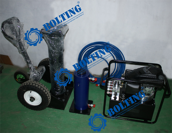為河南某重工企業定制的移動式液壓駕車機、汽油發動機動力液壓泵、雙作用液壓千斤頂準備發貨