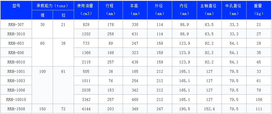 中空油缸(雙作用) ◆ 溢流閥在過載時保護油缸免受損壞; ◆ 烤漆表面提高抗腐蝕能力; ◆ 液壓缸在最大行程亦能承載最大荷重; ◆ 外環螺紋更易安裝(除RRH-1001和RRH-1508) ◆ 雙作用