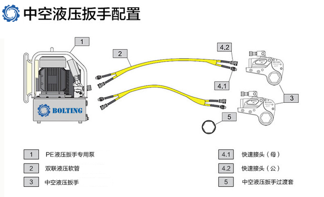 液壓扳手專用泵是液壓扳手的動力單元.。液壓扳手專用泵屬于高壓泵,最高工作壓力一般為70MPa,常見的有電動液壓泵和氣動液壓泵。如下液壓扳手配置圖: