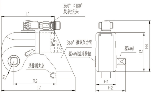 液壓扳手的工作頭主要由三部分組成,框架(也叫殼體),油缸和傳動部件。油缸輸出力,油缸活塞桿與傳動部分組成運動副, 油缸中心到傳動部件中心這個距離是液壓扳手放大力臂,油缸出力乘以力臂,就是液壓扳手理論輸出扭矩, 由于摩擦阻力存在, 液壓扳手實際輸出扭矩要小于理論輸出扭矩。
