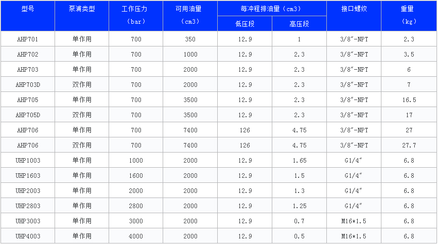 手動液壓泵: ◆ 所有手動泵均具備兩大特色-堅固耐用的結構與低手柄操作力; ◆ 鋁合金結構,全握型與防松脫設計的回油扭把,真正適合頻繁的日常使用與工業級的要求; ◆ AHP70